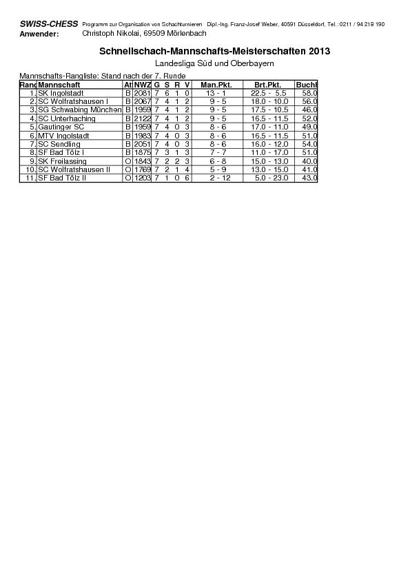 Am 15. September 2013 wurden in Bad Tölz die Schnellschach-Mannschaftsmeisterschaften Landesliga Süd und Bezirk Oberbayern ausgetragen.